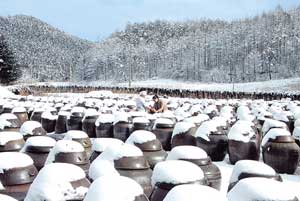 정선에서 백두대간의 백복령 넘어 동해시로 가는 길목의 작은 계곡(강원 정선군 임계면 가목리). ‘된장스님’ 돈연과 첼리스트 도완녀씨 부부가 일군 된장마을은 여기에 있다. 열병중인 군대처럼 도열한 2700개나 되는 커다란 항아리는 한 편의 설치예술 이 비길만 하다. 가족사진 촬영지로 ‘강추’할 만한 명소. 장독간 옆 소나무숲에는 돈연스님이 부인에게 선물로 마련한 ‘여래의 길’이라는 호젓한 산책로도 있다.