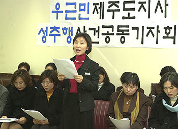 제주지역 여성권익옹호단체인 제주여민회는 21일 ‘제주도의회 도민의 방’ 에서 기자회견을 갖고 우 지사가 지난달 25일 오후 3시반경 자신의 집무실에서 제주시지역 여성단체 제주시지부장인 A씨와 면담하면서 A씨의 블라우스 단추를 풀고 가슴을 만지는 성추행을 저질렀다고 주장했다.