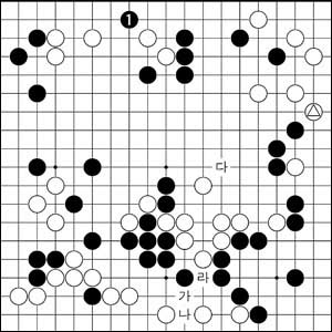 백이 중앙 백대마를 방치하고 △로 철저하게 실리를 취한 장면. 조 9단은 흑 1 한점을 미끼로 세를 쌓은 뒤 중앙 백대마를 공격할 참이다. 성동격서의 표본같은 수. 하지만 이 수에 앞서 흑 ‘가’와 백 ‘나’의 교환을 해야 했다. 그 다음 상변을 정리하고 선수를 잡아 흑 ‘다’로 공격하는 것이 이 장면의 정답. 하지만 ‘가’와 ‘나’를 해두지 않는 흑은 ‘라’로 연결해야 했고 백이 선수를 잡아 중앙 대마를 보강하자 국면은 흑 유리에서 미세한 형세로 바뀌었다.