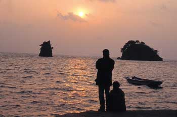 해변을 지키고 서 있는 것은 두 개의 바위였다. 오랜 풍화작용에 깎이면서 모나지 않게, 별로 위압적이지 않게 그러나 온갖 사연을 모두 담은 듯이 서 있는. 허리 구부정한 할아버지와 할머니를 닮았다고 해서 이름이 ‘할미 할아비 바위’라고 했다.