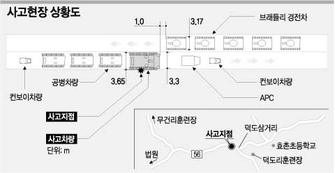 당시 사고차량 진행방향 맞은 편으로는 미군 브래들리 경전차 5대가 정반대로 덕도 삼거리 부근 집결지에서 무건리 훈련장으로 이동하고 있었다. 미군은 공병이 부교를 설치한 직후 전차부대가 공격에 나서는 반격 작전과정을 훈련하고 있었다.