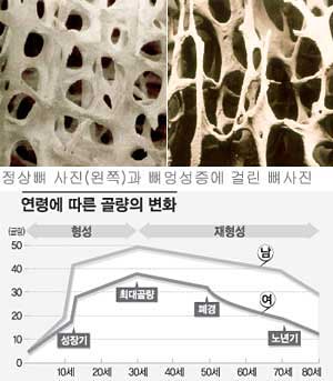 ▽원인과 진단〓뼈의 형성은 보통 20대 후반이나 30대 초까지 계속되고 이 때 뼈가 가장 단단해져 ‘최대골량’에 도달하게 된다(▶그래프 참조). 그 뒤에는 뼈의 형성과 더불어 오래된 뼈가 없어지고 뼈가 없어진 곳이 메워지는 재형성과정이 일생동안 반복된다.