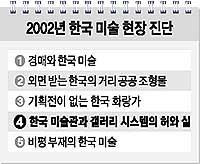 ▽갤러리의 근시안적 상업주의〓국내 갤러리들은 전시보다 돈되는 작가의 작품에만 눈독을 들인다는 비판을 받고 있다. 볼만한 기획전이나 초대전을 여는 갤러리는 서울에서 불과 20곳 내외. 한 미술인은 “갤러리들은 미술 시장을 튼실하게 다질 수 있는 장기적 안목을 가지고 이윤을 추구해야 한다”며 “마치 곶감 빼먹듯 돈되는 작가의 작품만 빼먹다 보면 얼마 되지 않아 미술 시장은 바닥날 것”이라고 우려했다.