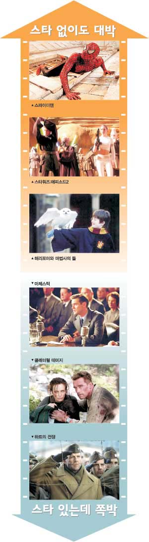 올해 여름 성수기 때 미국을 비롯해 전세계를 휩쓴 영화는 ‘스파이더 맨’과 ‘스타워즈: 에피소드 2’였다. 두 영화의 주연은 각각 토비 맥과이어와 헤이든 크리스텐슨. 누가 봐도 스타라고 하기 어렵다. ‘스파이더 맨’에서 토비 맥과이어의 출연료는 불과 400만 달러. 2001년의 흥행작 ‘해리 포터와 마법사의 돌’ ‘반지의 제왕’에서도 스타는 찾아보기 어렵다.