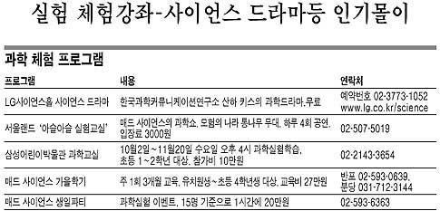 ▽사이언스 드라마〓올해 처음 선보인 사이언스 드라마 역시 과학체험 붐과 무관하지 않다. 사이언스 드라마는 전문 배우들이 과학실험을 재미있는 줄거리와 엮어 보여주는 것. 코 앞에서 실험의 전과정을 지켜볼 수 있으며 어린이들이 직접 무대로 나와 동참하기도 한다.
