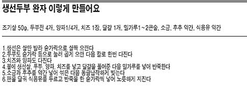 생선구이와 두부전은 아이들 반찬거리로 쓰세요. 생선구이에서 생선살을 곱게 발라 다지세요. 여기에 두부전을 으깨 넣고 양파 당근 등 다진 야채와 달걀, 밀가루 등을 버무려 반죽을 만드세요. 그런 다음 동글동글 빚어서 팬에 부치면 영양이 가득한 ‘생선 두부 완자’(사진)가 된답니다.