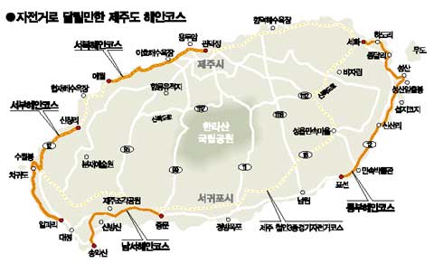코스는 취향에 따라 아기자기하게 정할 수 있다. 자전거 대여점에 문의하거나 인터넷 홈페이지들(주요 검색어 ‘제주도&자전거’를 입력)을 참조하면 된다. 현회장은 “제주시에서 출발해 일주한다면 일단 시계 방향으로 도는 것이 좋다”고 말했다. 제주가 지형적으로 동쪽이 서쪽보다 높아서 어려운 코스를 먼저 시작하는 것이 좋다는 것. 또한 제주 북부에는 서풍이, 남부에는 동풍이 우세해 바람을 등지는 것도 중요하다는 것이다.