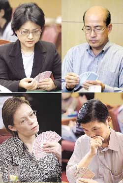 테이블마다 동-서, 남-북향으로 앉은 2명이 같은 편. 게이머들은 대부분 무표정한 포커페이스지만 ‘내가 구상하는 승부수를 건너편 내 파트너가 눈치 챘으면’ 하는 갈망이 언뜻언뜻 지나간다. 이날은 프로바둑 9단인 김수장 기사와 브리지 강사인 신의민씨 팀의 표정이 좋다. 게임이 잘 풀리기 때문이다. 중반에 약간 고전했지만 결국 3시간여의 게임 끝에 이 팀이 1등을 차지했다. 가벼운 박수가 터진다.