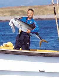 낚시 포인트인 섬 사이 바다까지는 배로 20분 거리. “물린 낚싯줄을 당기면 방어는 물 속 바위로 돌진해 줄을 끊어 버리니까 즉시 당겨야 합니다.” 낚싯배 경력 35년의 2002호 선장 김홍율씨(50)가 채비를 차려 주며 알려준 요령.