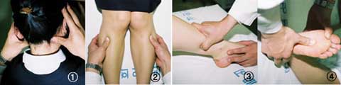 ②족삼리 자극〓이곳은 기를 아래로 끌어 내려주는 곳. 무릎 아래쪽 경계선에서 다리 바깥쪽의 가장 튀어나온 부위를 엄지손가락을 이용하여 위에서 아래로 내려가면서 눌러준다.