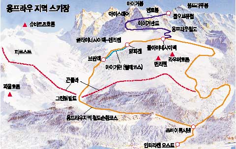 슬로프 정상인 오베르요흐(2501m). 스리 시스터즈를 중심으로 왼편에 베터호른과 슈렉호른, 오른편에 파울호른까지 알프스 ‘산의 바다’가 270도 파노라마로 펼쳐진다. 부드러운 경사의 광대한 설원. 온종일 햇볕 쏟아지는 양지바른 슬로프다. 가족스키어에게 좋을 듯. 마을까지 내려가려면 슈렉펠트와 보르트 두 마을을 차례로 거쳐야 한다. 거대한 스키장 융프라우 지역. 과연 이 슬로프를 모두 섭렵하려면 며칠이나 걸릴까. 한 1주일….