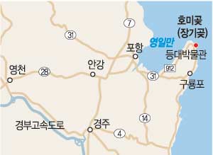 한반도의 최 동단으로 ‘해맞이 1번지’라 할 만한 호미 곶(포항시 대보면). 장기갑(岬)에서 장기곶, 다시 호미 곶으로 10여 년 새 거듭 이름이 바뀐 것만 보아도 범상한 곳이 아님을 알 수 있다. 호미 곶이란 이름은 격암 남사고(조선 명종 때 풍수가)가 이곳 지형을 호랑이 꼬리에 해당한다고 기록한 데 따른 것.
