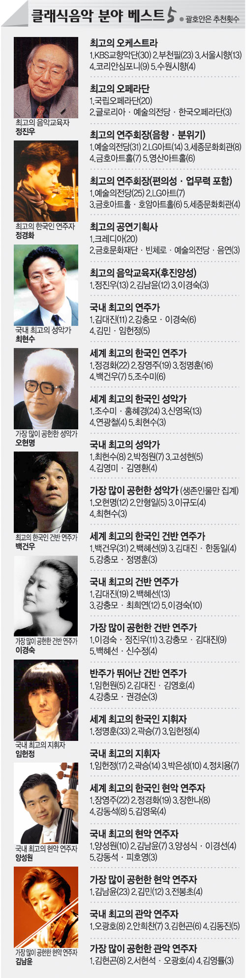 해외를 기반으로 활동 중인 연주가를 제외한 국내 연주가 중에서는 성악에 최현수, 건반악기에 김대진, 지휘에 임헌정, 현악에 양성원이 각각 ‘최고의 연주가’로 지목됐다.