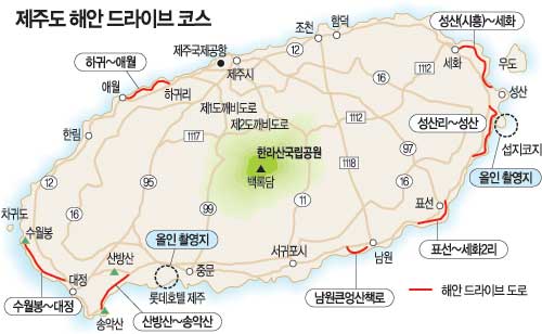 렌터카로 달리는 제주도 해안도로. 제주여행길에 빼놓을 수 없는 추억 만들기 여행코스다. 한가롭기는 성산∼세화, 사진촬영하기에는 산방산∼송악산, 옥빛 바다빛깔 감상하기에는 하귀∼애월, 운치로는 수월봉∼대정 구간이 최고다.(위치는 지도에).