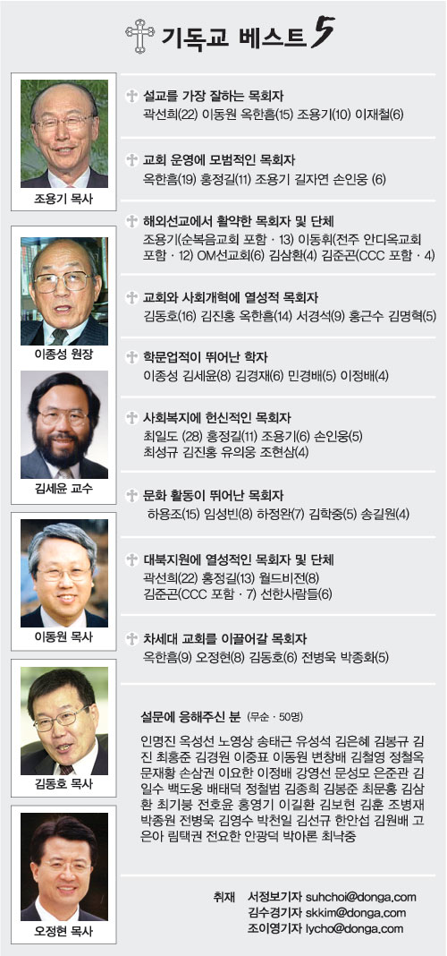 교회개혁과 사회개혁에 관심있는 목회자로는 대형교회를 나와 개척교회를 시작한 높은뜻 숭의교회 김동호(52) 목사가 많은 추천을 받았다. 두레교회 김진홍(63) 목사와 옥한흠 목사가 그 뒤를 이었다. 한 교계 기자는 “응답자들이 주로 교회개혁 위주로 답변을 해 사회개혁을 위해 활발히 활동한 원로들인 강원룡 박형규 목사 등이 비교적 적은 추천을 받은 것 같다”고 말했다.