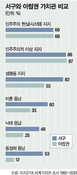 일례로 이집트 모로코 터키 등 이슬람국가의 민주주의 체제에 대한 지지율은 미국(89%)보다 높게(92∼99%) 나타나기도 했다. 그러나 두 문명권의 차이는 ‘남녀 평등’ ‘동성애’ ‘이혼’ 등 성과 관련한 태도에서 확연히 드러났다는 것이다.