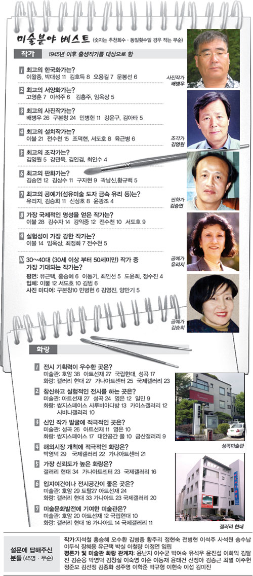 최고의 전시공간을 묻는 질문에서는 단연 삼성 미술관이 운영하는 서울 중구 순화동 호암갤러리와 갤러리 현대가 꼽혔다. 또 참신하고 실험적인 전시를 하는 미술관은 아트선재센터가, 화랑은 사루비아다방과 쌈지스페이스가 공동 1위로 꼽혔다.