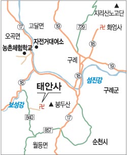 ![]() 화엄사 지나 들어선 구례. 군청 앞에서 18번 국도(2차로)를 따른다. 녹음방초 신들린 듯 피어나는 춘색 도도한 곡우 막 지난 지금. 4㎞쯤 지나 왼편에 강이 보인다. 섬진강이다. 이 강을 끼고 달리기를 7㎞. 두 물 만나는 압록에서 다리(예성교) 건너 보성을 향한다. 이번에는 18번 국도가 보성강 왼편에 놓인다. 6㎞ 전방. ‘태안사’ 푯말이 보인다. 절은 예서 7㎞. 840번 지방도로는 산과 산이 이룬 골 안을 가른다. 옹색하다 싶을 만큼 좁은 골 안의 평지. 곡성(谷城)은 이름 그대로다. 사방팔방 둘러보아도 온통 산. 절은 길가의 건모(乾毛)마을에서 비포장 산길로 이어진다. 태안사의 진면목은 예서부터다.