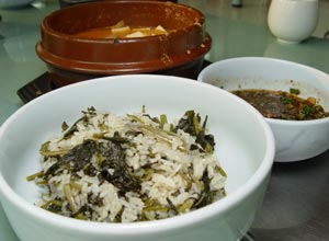 돌솥에 곤드레 나물을 앉혀 지은 이 밥. 솥뚜껑을 여니 하얀 쌀밥에 섞인 초록빛 나물과 향긋한 나물 향이 식욕을 자극한다. 나물밥은 각자 그릇에 덜어 참기름 들기름을 넣어 고소한 냄새 진동하는 양념간장을 뿌려 비빈다. 반찬은 뚝배기에 끓여낸 콩비지 찌개와 김치.