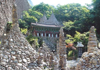 골짜기 절터를 빼곡하게 채우고 있는 수많은 돌탑 때문이다. 가장 높은 곳의 가장 큰 규모 한 쌍은 천지탑, 그 주변은 오행을 상징하는 오행 탑이 호위하는 형국이다. 여기 탑은 모두가 음양오행의 우주의 질서에 따라 자리 잡고 세워졌다는 설명이다.