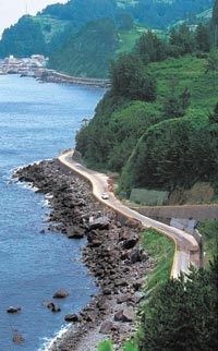 바다에서 본 것만으로는 부족하다. 해안 도로(지방도 926번)를 자동차로 달리며 섬의 아름다움을 몸으로 느껴보자. 해안도로는 40년 난공사에도 불구하고 뚫지 못한 일부 구간(섬목∼내수전 4.4km) 덕분에 ‘일주’를 달성치는 못했다. 그러나 그 풍광만큼은 국내 최고라 할 만하다. 국내 최고의 건설비(1m당 193만원)가 들어간 가장 비싼 도로인 점도 기억해야 한다. 울릉도에서는 좀처럼 보기 힘든 신호등 달린 교차 통행 터널(3개)등 6개의 터널, 360도 이상 회전하는 나선식 고가도(수층 도로), 지나다 파도 맞는 물가 도로 등등은 육지에서 좀처럼 볼 수 없는 ‘메이드 인 울릉도’다.