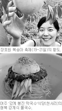 축제장은 이천(경기)과 음성(충북)의 도경계인 청미천 둔치. 재배 농가가 무려 500호나 밀집한 장호원 복숭아의 원산지 백족산 아래다. 산자락 뒤덮은 남천 마을(오남 3리)의 복숭아 과수원에 가보니 봉투 뒤집어 쓴 황도가 가지마다 주렁주렁 매달려 있다. 진영 농원 주인 문용기씨(011-249-4194)는 “복숭아는 냉장고에 넣지 말고 상자 채 통풍이 잘되는 곳에 한 이틀 두어 숙성시켰다가 먹어야 맛있다.”고 요령을 알려주었다. 요즘 가격은 15개 들이 한 상자(4.5kg)에 2만∼2만5000원. 축제장에 오면 맛있는 황도를 맛보며 살 수 있다. 전화 주문 택배도 가능.