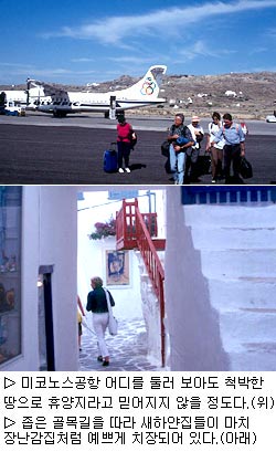 미코노스섬에 착륙 직전 비행기에서 눈 아래 펼쳐진 섬의 전경을 보면 섬의 여행은 실망으로 시작된다. 사방을 둘러보아도 세계적인 휴양지라고 할만한 수준은 아니다. 그렇다고 다른 섬들처럼 고대 그리이스 문명을 대표하는 유적이 있는 것도 아니다.