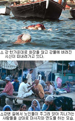 목욕하는 사람들이 갑자기 시선을 한군데로 모으는 것이 보였습니다. 어떤 물체가 둥둥 떠서 내려오는 것이 보입니다. 가까이 밀려오자 그것이 화장을 않고 강물에 버려진 시신이라는 것을 알게 되었습니다.