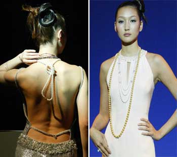 세련된 칵테일 드레스나 유혹적인 이브닝 가운에는 알이 7mm 이상의 크고 긴 것으로 두 줄 또는 세 줄 목걸이가 좋다.
