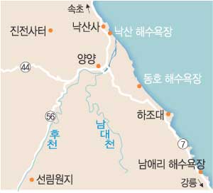 낙산해수욕장을 시작으로 양양군 내에는 동호, 하조대, 남애리 등 이름난 해수욕장이 많다. 아울러 제철은 지났지만 연어축제로 유명한 남대천을 따라 올라가 보는 일 또한 운치 있을 것이다.