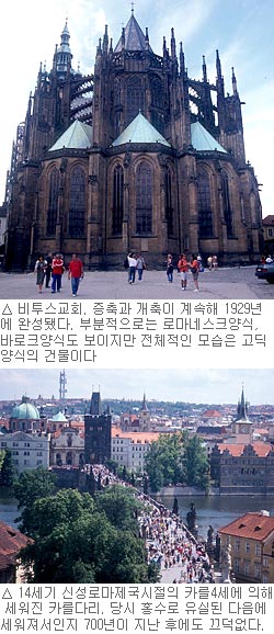 왕궁의 언덕 위에 세워진 프라하성은 그 역사가 9세기까지 거슬러 오르지만 프라하성의 중심인 성비투스 성당은 1344년 신성로마제국의 황제였던 카를 4세에 의해 세워진 것으로 그 후에도 증축과 개축이 계속 진행됐으며, 지금의 모습으로 완성된 것은 1929년이라 한다. 부분적으로는 로마네스크양식, 바로크양식도 보이지만 전체적인 모습은 고딕양식의 건물이다.