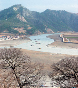 게서 내려다본 물 나간 포구. ‘바다의 하회마을’이라고나 할까. 계곡에서 흘러나온 물이 갯골(푹 패어 썰물 때도 물이 고이는 물골)을 따라 갯벌을 감싸 안듯 동그랗게 휘돌아 흐르면서 오른편의 바다로 흘러드는 형국이 영락없는 물돌이동이다.