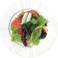 ▽재료=새우 5개, 오징어 반마리, 샐러드용 야채 약간, 딸기 3개, 키위 1개, 크루통 약간, 올리브 오일 드레싱용 재료