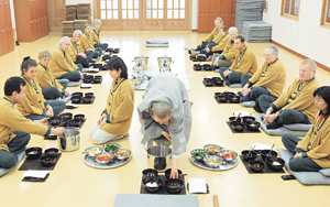 발우공양 시간. 단순한 식사가 아니라 수행의 한 과정이다. 자신이 먹을 양만큼만 덜고 스스로 선택한 양은 책임을 져야 한다. 고춧가루 하나 남기지 않고 먹어야 하고 한 컵 정도의 물로 그릇을 닦아 그것마저 마신다. 그동안 얼마나 많은 음식을 버려 환경을 오염시키고, 설거지로 소중한 물을 낭비했는지 절실하게 깨닫게 된다. 또 여럿이 음식을 나눠먹는 평등심과 음식을 탐하지 않고 몸을 지탱하는 약으로 먹는다는 정진심까지 함축되어 있다.