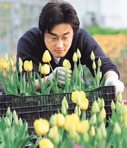 튤립은 밥그릇보다 조금 큰 플라스틱 화분 안에서 재배되는데 화분 하나에 구근(튤립의 알뿌리) 하나씩만 집어넣어. 온실 안에는 이제 막 싹이 나온 것부터 봉오리가 맺힌 것까지 몇 단계의 튤립들이 자라고 있단다.
