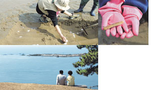 이곳에선 국물이 시원한 바지락, 구우면 더욱 맛있는 모시조개, 뽀얀 속살이 쫄깃한 돌조개 등 각양각색의 조개를 직접 잡아 볼 수 있다. 그러나 이곳 개펄체험의 백미는 뭐니 뭐니 해도 맛 잡기. 보통 조개는 호미로 개펄 흙을 파낸 후 줍지만 맛은 구멍이 뚫린 개펄 안에 소금을 뿌리면 구멍 속에서 쏙 튀어나온다. 처음 간 사람들도 다른 이들이 하는 것을 어깨너머로 보면 금세 따라할 수 있다.
