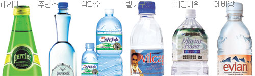 ▽에비앙=프랑스 알프스의 만년설이 녹아 15년간 빙하 퇴적층을 통과해 자연 여과되면서 만들어진 물. 유명 연예인들이 목욕할 때 쓴다고도 알려져 있다. 칼슘 함량이 높아 물맛이 텁텁하게 느껴질 수도 있다. 하루 200회 이상 자체 수질검사를 거친 뒤 병에 담아 판매한다. 330mL 750원, 500mL 1000원, 1.5L 2000원.