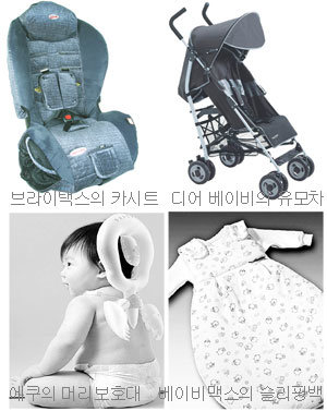 ▽산책할 때=유모차는 안전장치가 중요하다. 아가방의 ‘스포츠마인드 유모차’는 차체를 가벼운 알루미늄 소재로 처리해 휴대성을 높였다. 360도 회전이 가능한 앞바퀴와 고정이 가능한 뒷바퀴로 차체의 안전성을 강화했다. 14만9000원.