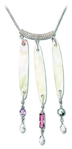 □크리스털 전문 업체 스와로브스키는 다양한 커팅의 파스텔톤 크리스털 펜던트가 달린 ‘페이 컬렉션’을 선보였다(사진). ‘마더 오브 펄’이라 불리는 조개껍데기로 체인과 펜던트를 연결해 고급스럽다. 19만4000원, 24만2000원 두 종류. 02-3454-0650