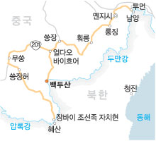 1단과 2단 기어를 반복하며 천천히 산길을 오르는 버스. 도로 옆에는 군데군데 채 녹지 않은 잔설이 3∼4m씩 쌓여 있었다. 해발 2300m 지점. 뒤를 돌아보니 감탄의 말조차 잃을 만큼 아름다운 풍경이 펼쳐졌다. 너울처럼 부드러운 파형의 구릉지대 아래로 지평선까지 수백 km나 이어진 거대한 초록빛의 백두임해(林海), 장대한 숲의 바다다.