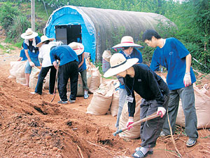 과수원 주인아주머니인 이정자씨(69)는 “학생들이 없었다면 복구할 엄두도 못 내고 허물어진 둑을 방치해뒀을 것”이라며 “워낙 일손이 모자라다보니 기구가 있어도 전혀 도움이 안 된다”며 반가워했다.