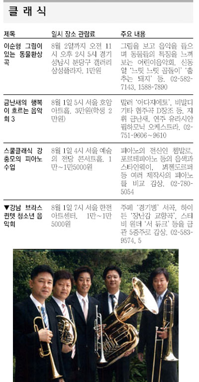 | 청소년을 위한 국악체험교실 ‘장구치고 공연보고’ | 8월 1∼31일 7시20분 정동극장. 2만원 | 장구 배워보기, 전통예술무대 공연관람, 다함께 강강술래 등으로 구성된 체험 프로그램. 02-751-1500∼3 |