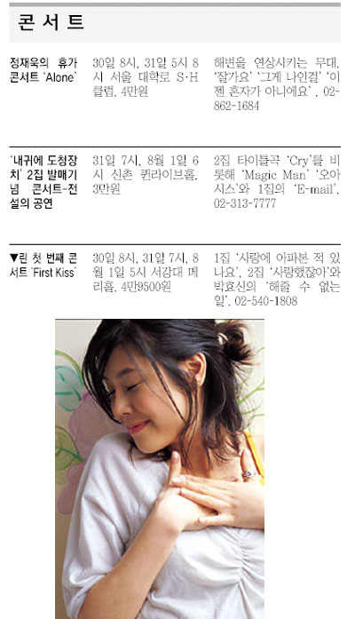 | 선데이서울 | 8월 15일까지 평일 7시반 금 토 일 4시반 7시반 서울 정미소 극장. 1만5000∼2만5000원 | 병든 아내에게 보험금을 타주기 위해 자살하려는 남자, 그 남자를 위해 기꺼이희생하는 조선족 처녀의 이야기. 배두나 출연. 02-3672-6989 |