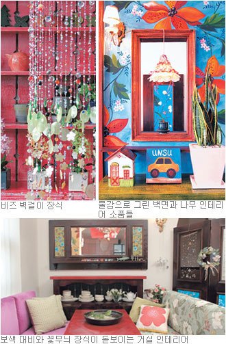 ▽꽃과 나비=물감으로 가구에 직접 그림을 그려 넣는 그는 주로 원색의 꽃과 나비 문양을 사용한다. 짙은 오크색 콘솔 서랍이나 나무 옷장 문에 화려한 꽃밭을 그려 넣는 식이다. 어린이용 가구로도 수요가 많지만 집이 넓은 40대 부부들이 즐겨 찾는다. 인테리어에 관심이 많은 가수 이승환과 탤런트 채림 부부, 방송인 최유라씨도 단골 고객이다.