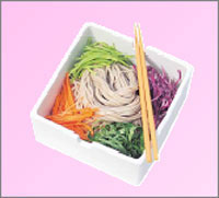 재료:메밀국수 200g, 붉은 양배추 50g, 당근 50g, 오이 50g, 깻잎 50g, 무 약간, 김 1장, 육수용 재료(물 5컵, 다시마 반 장, 가쓰오부시 50g, 간장 5작은술, 설탕 1작은술, 청주 3작은술)
