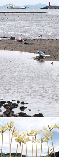 이즈음에 위도를 찾는 이라면 귀기울여야 할 것이 있다. ‘흰 상사화’라는 보기 드문 들꽃이다. 이즈음 고창 선운사 경내 숲 속을 온통 뒤덮는 빨간 상사화와 달리 꽃이 흰 이 들꽃은 ‘위도상사화’라고도 불리는데 8월 중순부터 섬에 피기 시작해 한 달쯤간다.