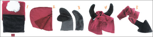 4. 후드 양쪽에 귀를 손바느질로 꿰매 붙인다. 양쪽의 균형을 염두에 둬야 한다. 후드 아랫부분에 벨크로 테이프를 붙인다.