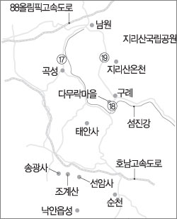▽구례 △다무락 마을(http://damurak.go2vil.org)=김영두 이장 016-9810-8066 △송광사↔선암사 산길=8km △꽁보리밥집(주인 최석두)=061-754-3756. 송광사로부터 3.5km(1시간10분 소요). 명절 당일만 쉼. △남도음식문화큰잔치=www.namdofood.or.kr