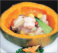 ▽재료=600g 정도의 단호박 반 개(가로로 자른 것), 송이 약간, 해삼 2조각, 전복 반 개, 은행 3알, 생선머리 말린 것(중국요리 재료점에 있다)과 도가니(연골) 약간씩