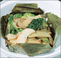 ▽재료=연잎 1장, 송이 약간, 브로콜리 2개, 아스파라거스 10cm 크기), 죽순 2개, 새송이 2개